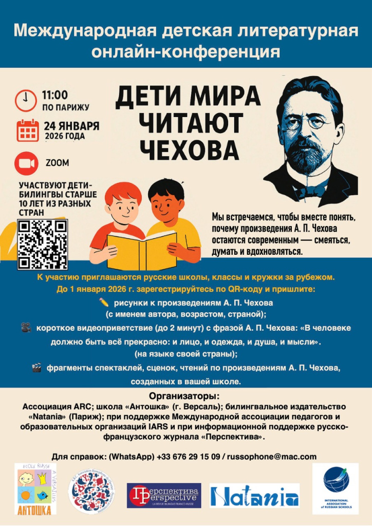 24 января 2026 года в 11:00 (по парижскому времени) состоится международная детская литературная онлайн-конференция «Дети мира читают Чехова». Мероприятие объединит детей-билингвов старше 10 лет из разных стран.