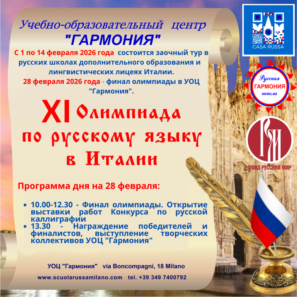 В Италии стартовала XI Олимпиада по русскому языку, посвящённая Международному дню родного языка. Организатором выступает учебно-образовательный центр «Гармония» (Милан) при поддержке фонда «Русский мир» и Русского Дома в Риме.